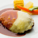 和牛をミルフィーユ風に重ねた衣サクッサクのビフカツです。デミグラスソース、特製サルサ風ソースの2種類のソースでどうぞ。
